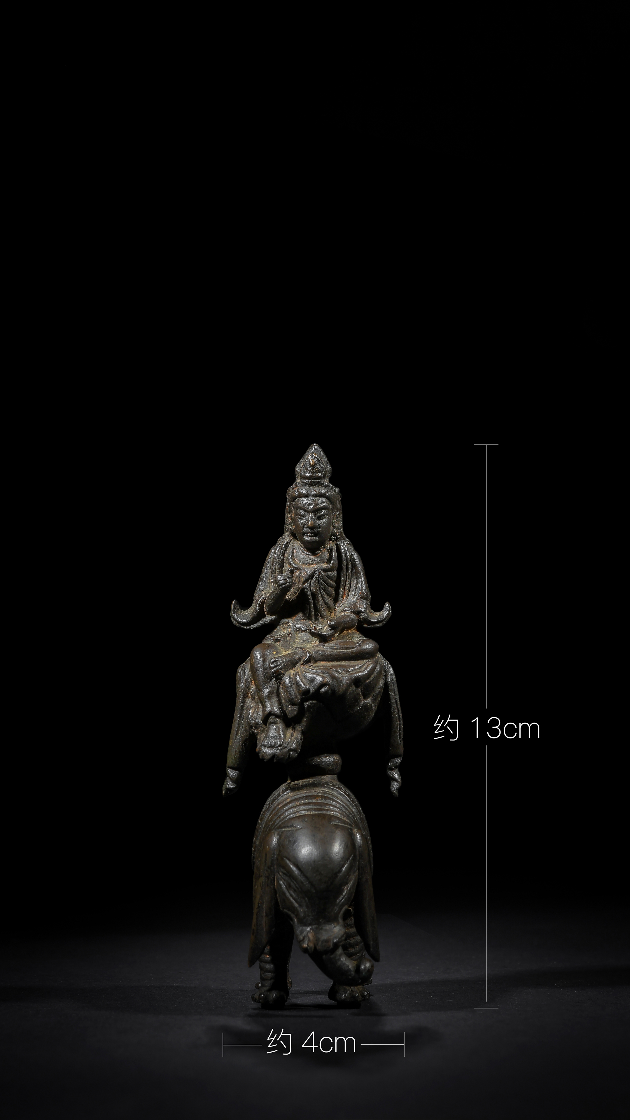 普贤菩萨是佛教四大菩萨之一。此尊游戏坐于象背之上莲花高座上,头饰高发髻,有一顶化佛,面相圆润,面容悲悯;上身着袈裟,下身着衣裙,衣纹流畅自然,双手置胸前结印,形象生动、亲切。象头温顺低垂,大耳下耷,六牙前伸,身躯健壮,造型极其生动。整躯造型端庄,做工精细,保存完好,是一尊非常难得的五代时期佛像珍品。