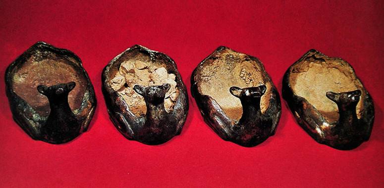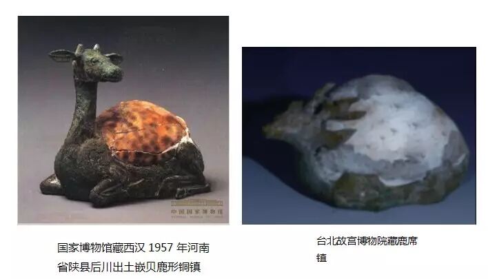 本人有幸从一位台湾资深藏家手里看到过一组四只鹿形嵌贝席镇,他当时特别激动的告诉我,这可是战国时期作品,因为和台北故宫博物馆藏品一模一样。