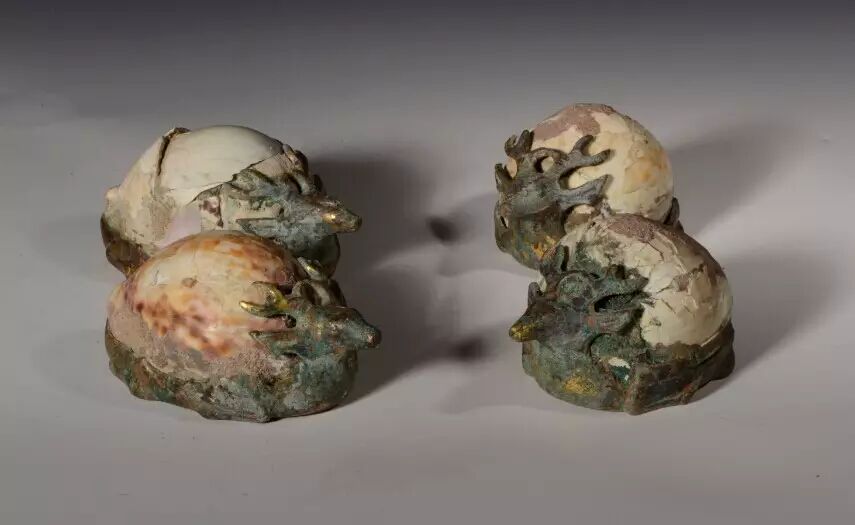 古人对鹿的喜爱,可不只是作为图腾来顶礼膜拜的,还用作日常生活用品的装饰上。震惊中外的西汉大墓-南昌海混侯大墓,出土藏品种类之丰富,级别之高,不知吸引了多少眼球。但最令我感兴趣的是一套鹿席镇,四小小鹿看上去“萌萌哒”,鹿首向前昂扬,身侧前腿蜷曲,后腿隐于身下,真是可爱极了。